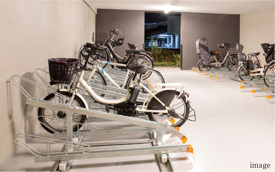 セキュリティエリア内に設けた屋内型の駐輪場・バイク置場。鍵付きで安全性が高く、オートドアで出入りもスムーズ。雨に濡れる心配もなく、快適に利用できます。