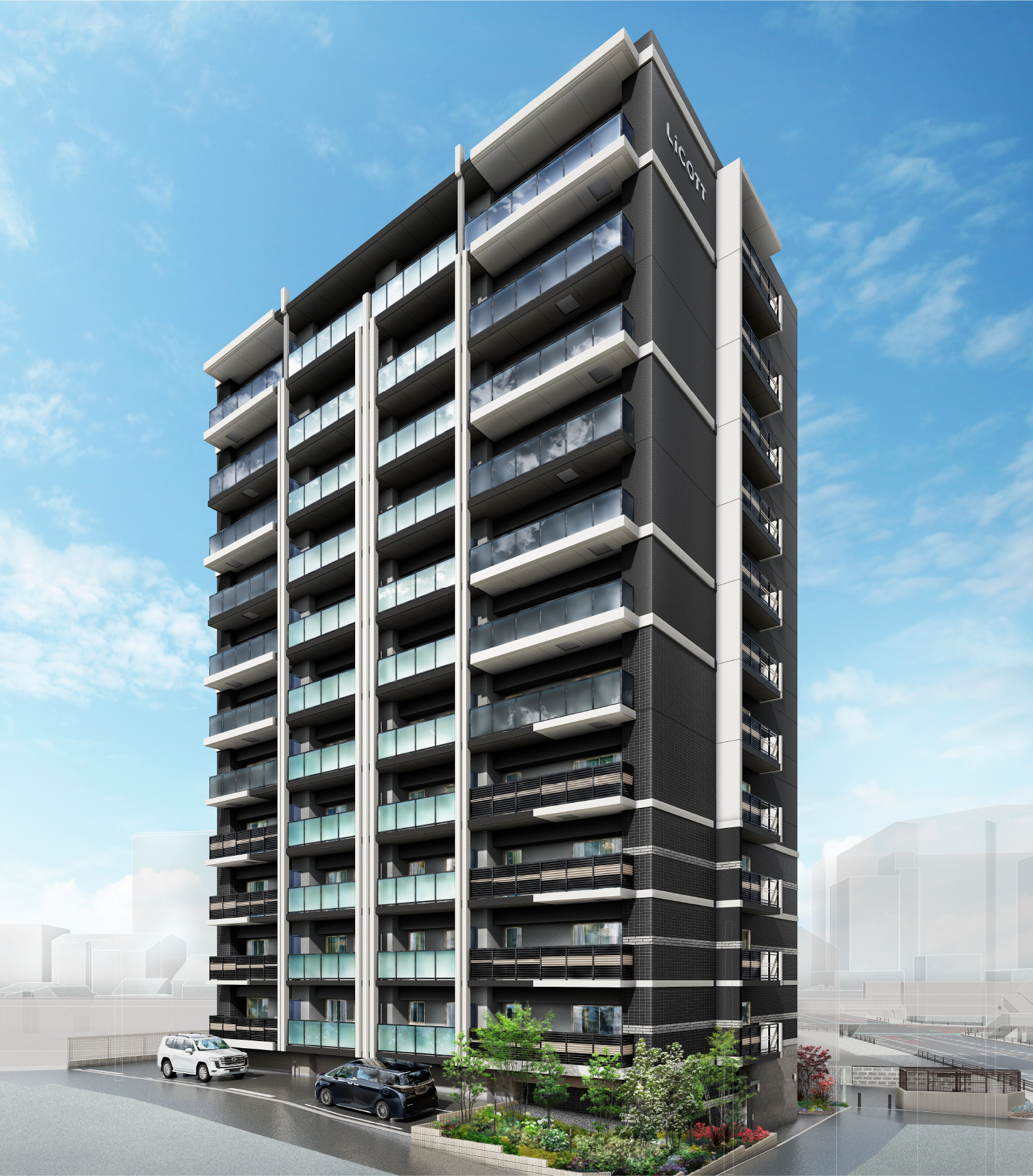 外観は垂直ラインを濃淡で強調し都会的でスリムな印象を表現し、