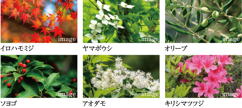 住まう方を迎えるエントランスアプローチや、2面道路に面した敷地角には、立体感のある植栽を配置。イロハモミジやヤマボウシ、オリーブなど多彩な樹種を組み合わせ、季節の移ろいと緑の潤いを感じられる空間を演出しました。中木・低木をバランスよく配し、自然と調和する美しい景観を創り出しています。