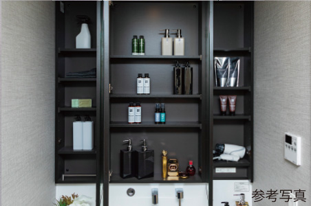 洗面化粧台のミラー裏には、化粧品や洗面用具を整理して収納できる棚を設置。目に付かない場所にたっぷり収納できます。
