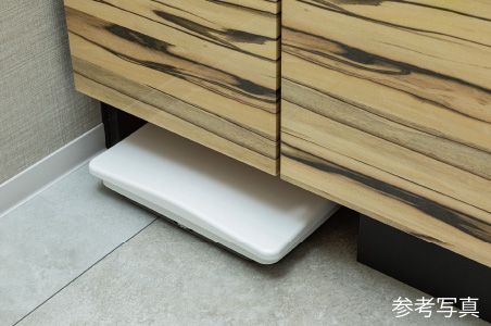 洗面化粧台の足元スペースを活かしたヘルスメーター収納。場所を取らずに、すっきり美しく収納できます。