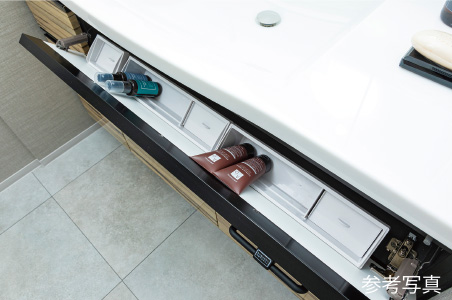 洗面ボウルの手前に、メイク用品などの収納に便利なポケットを設置。細かく仕切りがあるので使いやすく快適です。