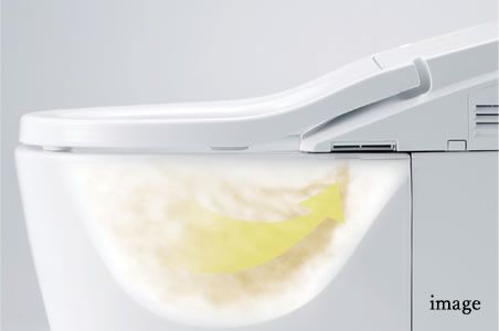 便座に座ると、自動でプレミストを吹き付けます。水と相性のよいセフィオンテクトだから、ミストが便器表面に広がり、汚れをつきにくく、落ちやすくします。