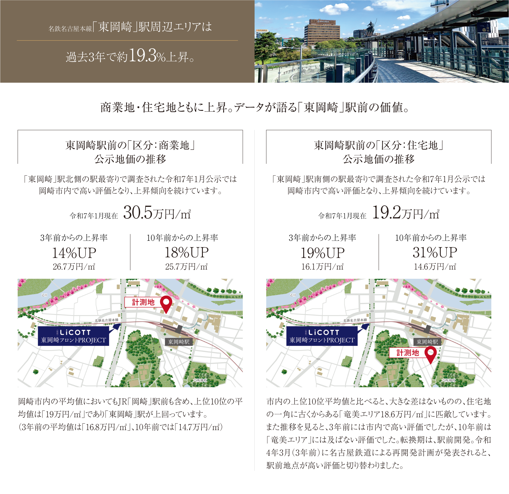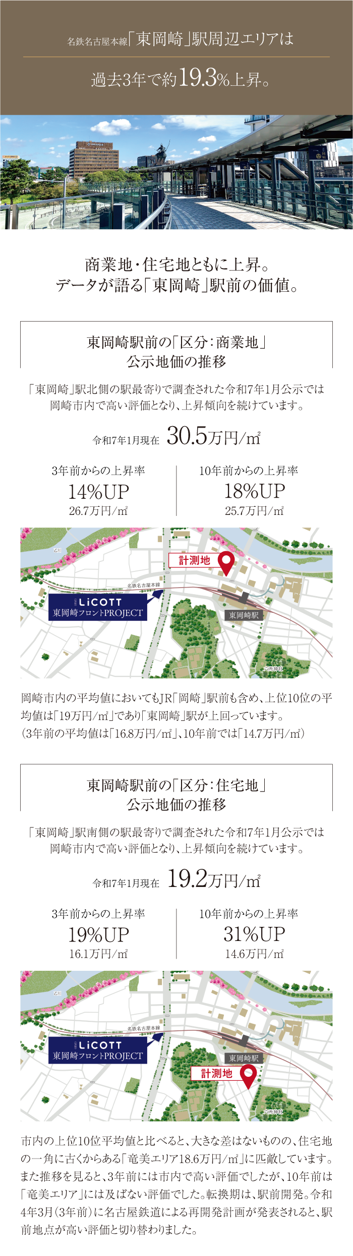 ※東岡崎駅前の地価情報を、区分:商業地、区分:住宅地にてそれぞれ、各駅に最も近い公示地価調査地点における、令和7年1月起点の過去10年間の公開情報を基に掲載したものです。また市内における他地点のそれぞれの公示地価及び平均値においても令和7年1月起点の過去10年間の公開情報を基に掲載したものです。